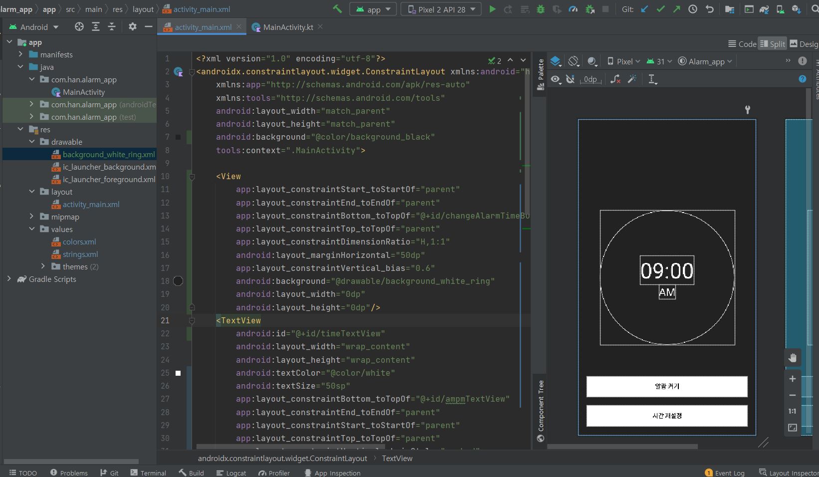 시간이 뜨는 TextView 뒤에서 동그란 하얀 선이 생기도록 동그란 원을 만들어주었습니다.